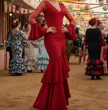 Trajes de tejido elástico de licra que garantiza adaptación y confort. Disponibles en talla XS, M, XXL. Se caractariza por su uso de tejido elástico de alta calidad, lo que permite tanto precisión en la talla como libertad para el movimiento y el baile. A diferencia de los vestidos de flamenca clásicos hechos en tejidos rígidos, este modelo ofrece mayor versatilidad sin sacrificar la silueta tradicional andaluza.
