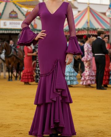 Fabuloso traje de flamenca, marcando estilo. Tiene dos volantes en pico y es liso y con las mangas largas semitransparentes.