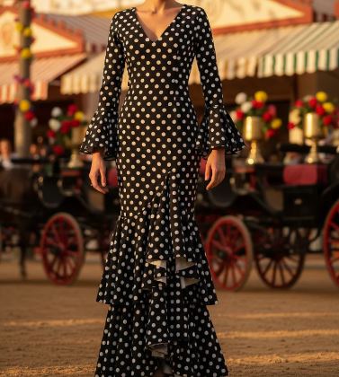Trajes de tejido elástico de licra que garantiza adaptación y confort. Disponibles en talla XS, M, XXL. Se caractariza por su uso de tejido elástico de alta calidad, lo que permite tanto precisión en la talla como libertad para el movimiento y el baile. A diferencia de los vestidos de flamenca clásicos hechos en tejidos rígidos, este modelo ofrece mayor versatilidad sin sacrificar la silueta tradicional andaluza.