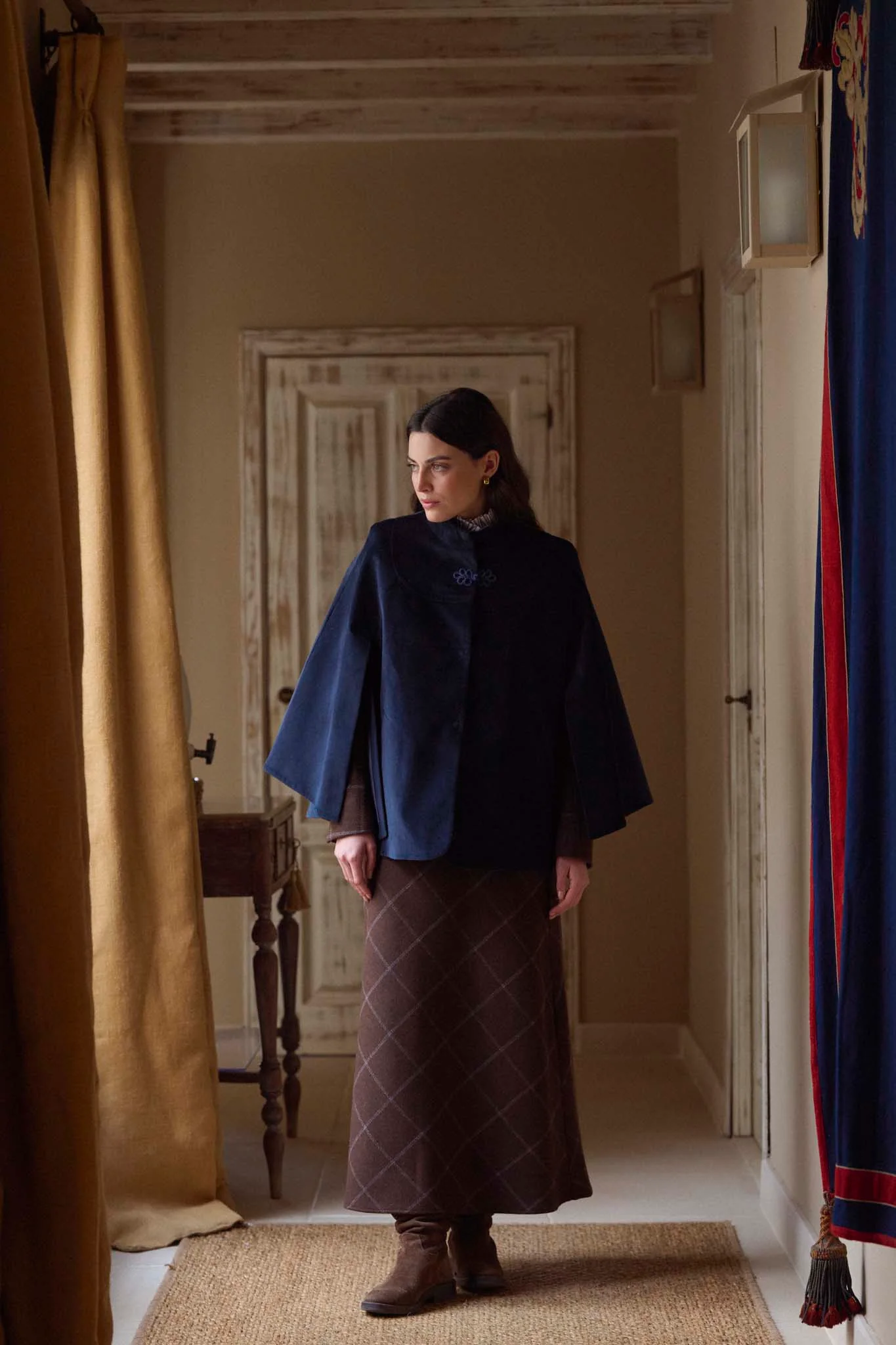 Capa en terciopelo azul, de silueta amplia con cuello alto, cierre frontal con alamar decorativo en la parte superior. Con forro interior completo. Su confección artesana en España se percibe en cada detalle y en la calidad de una prenda a la par clásica que original.