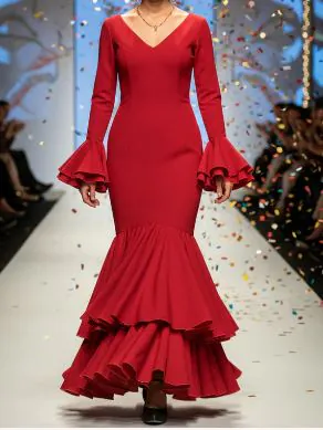 Vestido de flamenca liso, de dos volantes y manga larga.