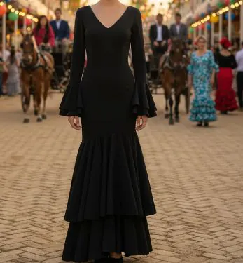 Trajes de tejido elástico de licra que garantiza adaptación y confort. Disponibles en talla XS, M, XXL. Se caractariza por su uso de tejido elástico de alta calidad, lo que permite tanto precisión en la talla como libertad para el movimiento y el baile. A diferencia de los vestidos de flamenca clásicos hechos en tejidos rígidos, este modelo ofrece mayor versatilidad sin sacrificar la silueta tradicional andaluza.