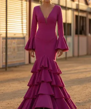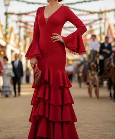 Trajes de tejido elástico de licra que garantiza adaptación y confort. Disponibles en talla XS, M, XXL. Se caractariza por su uso de tejido elástico de alta calidad, lo que permite tanto precisión en la talla como libertad para el movimiento y el baile. A diferencia de los vestidos de flamenca clásicos hechos en tejidos rígidos, este modelo ofrece mayor versatilidad sin sacrificar la silueta tradicional andaluza.