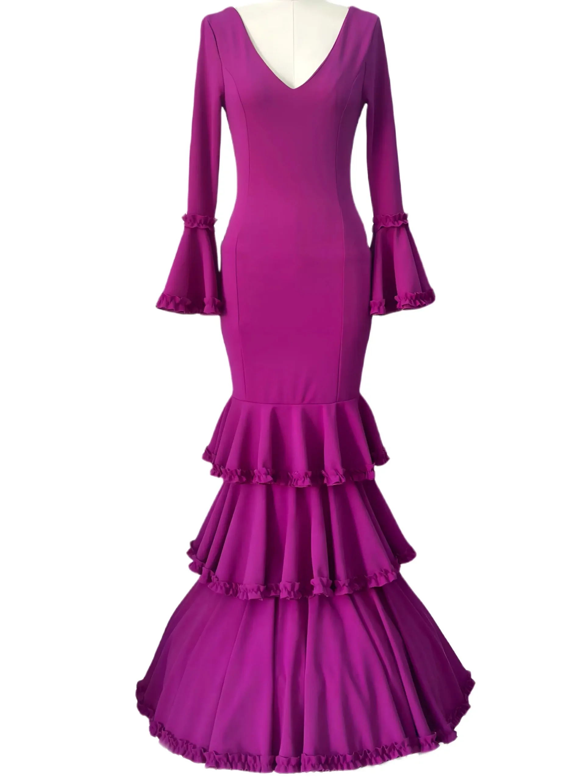 Vestido de Flamenca liso con tres volantes rematados con un pequeño volantito. Son lisos y los tenemos de color Buganvilla, Rojo, Negro y Berenjena.