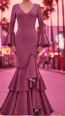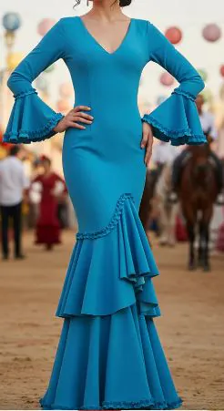 Trajes de tejido elástico de licra que garantiza adaptación y confort. Disponibles en talla XS, M, XXL. Se caractariza por su uso de tejido elástico de alta calidad, lo que permite tanto precisión en la talla como libertad para el movimiento y el baile. A diferencia de los vestidos de flamenca clásicos hechos en tejidos rígidos, este modelo ofrece mayor versatilidad sin sacrificar la silueta tradicional andaluza.