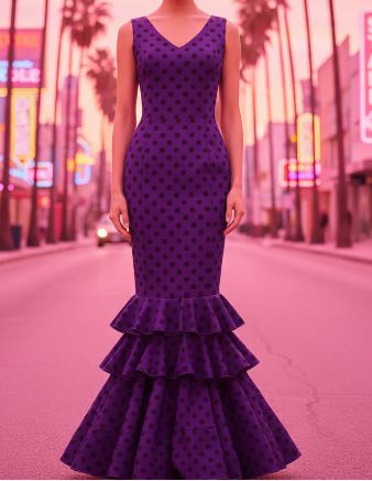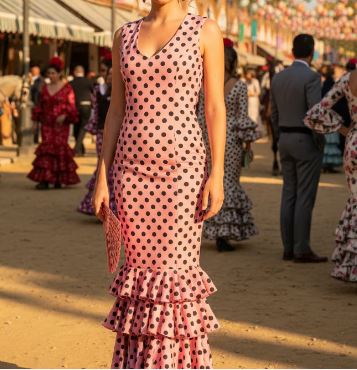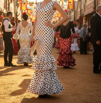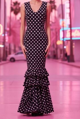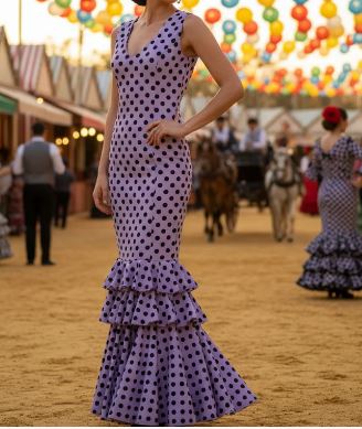 Trajes de tejido elástico de licra que garantiza adaptación y confort. Disponibles en talla XS, M, XXL. Se caractariza por su uso de tejido elástico de alta calidad, lo que permite tanto precisión en la talla como libertad para el movimiento y el baile. A diferencia de los vestidos de flamenca clásicos hechos en tejidos rígidos, este modelo ofrece mayor versatilidad sin sacrificar la silueta tradicional andaluza.