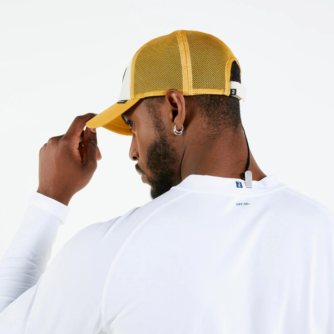 Nuestros diseñadores han desarrollado esta gorra para protegerte del sol con estilo. Gracias a su cordón para tormentas desmontable y pinza, ya no la perderás.