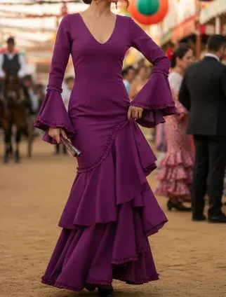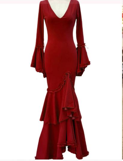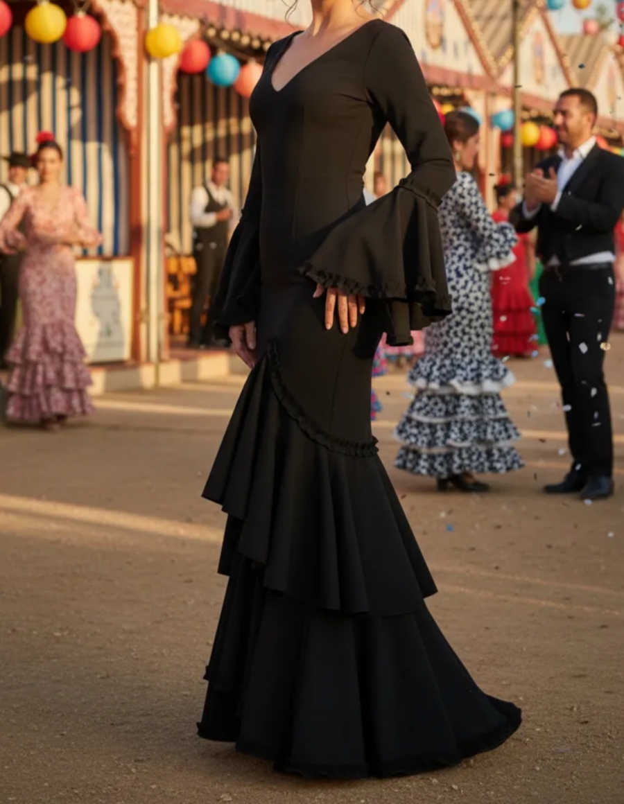 Trajes de tejido elástico de licra que garantiza adaptación y confort. Disponible en talla 52/54. Se caractariza por su uso de tejido elástico de alta calidad, lo que permite tanto precisión en la talla como libertad para el movimiento y el baile. A diferencia de los vestidos de flamenca clásicos hechos en tejidos rígidos, este modelo ofrece mayor versatilidad sin sacrificar la silueta tradicional andaluza.