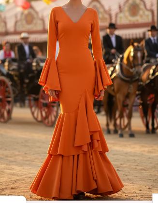 Trajes de tejido elástico de licra que garantiza adaptación y confort. Disponibles en talla XS, M, XXL. Se caractariza por su uso de tejido elástico de alta calidad, lo que permite tanto precisión en la talla como libertad para el movimiento y el baile. A diferencia de los vestidos de flamenca clásicos hechos en tejidos rígidos, este modelo ofrece mayor versatilidad sin sacrificar la silueta tradicional andaluza.