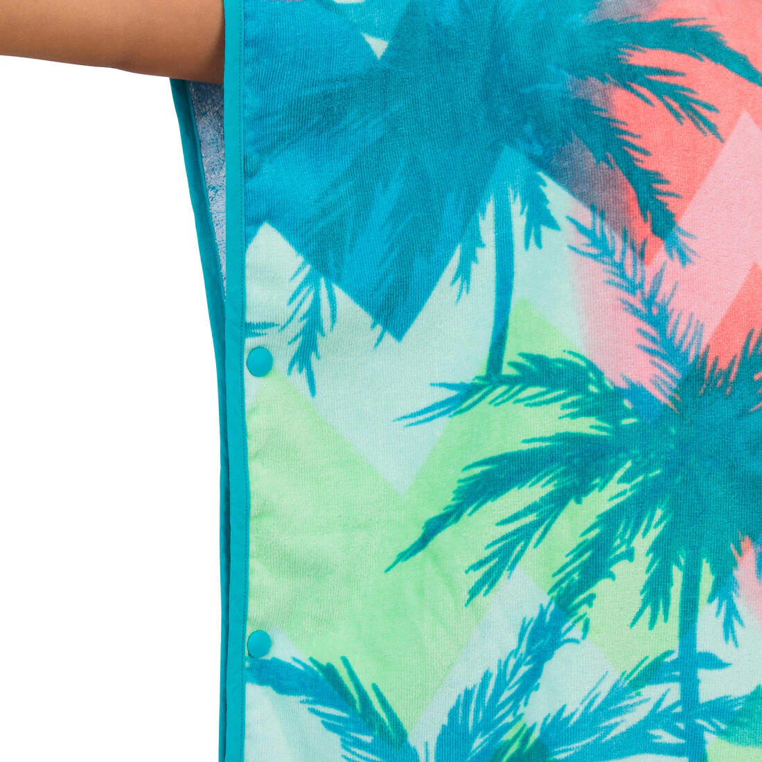Este poncho es muy fácil de usar gracias a los botones de presión a ambos lados. Desabrochado y desplegado, se convierte en una práctica toalla de playa, ideal relajarse después de surfear.