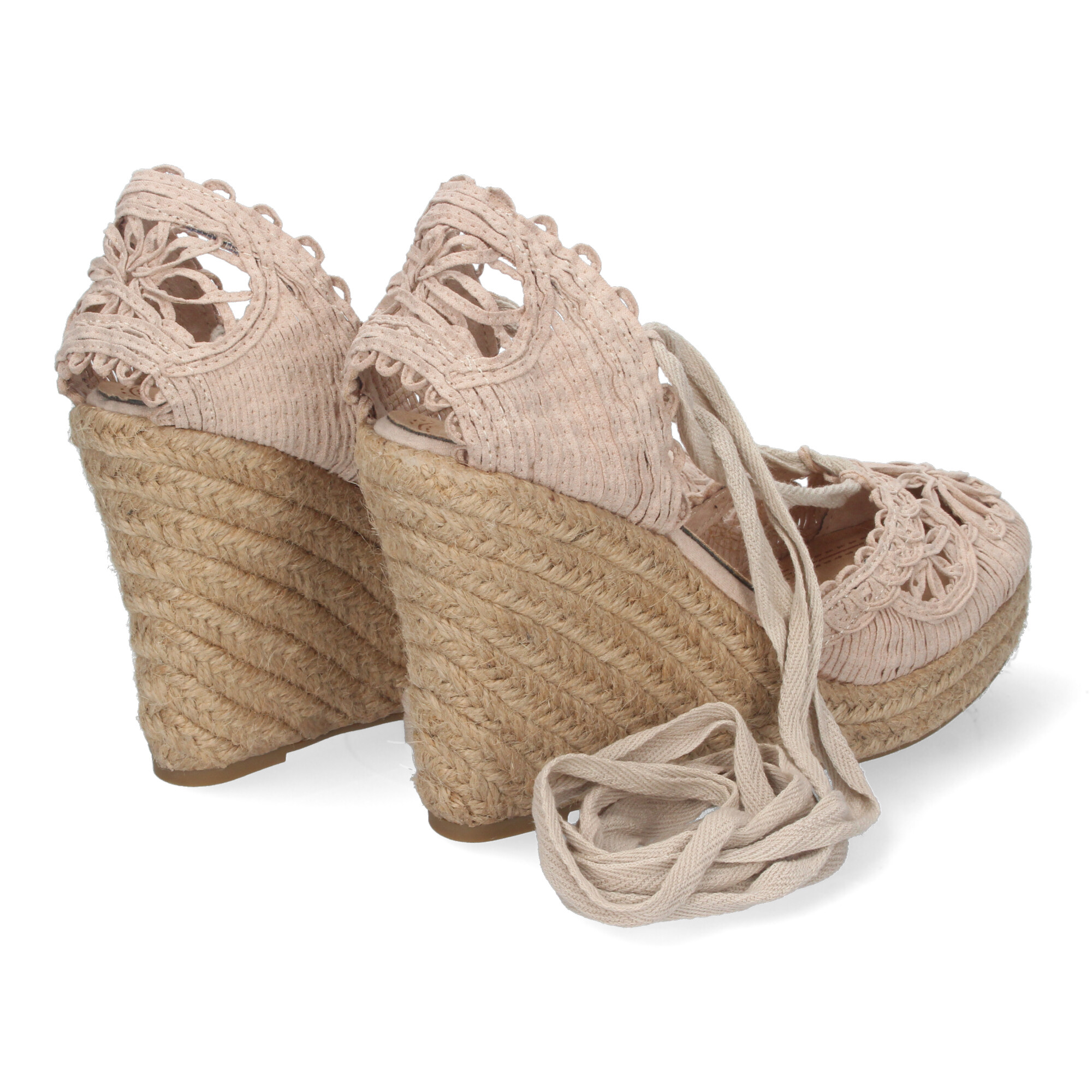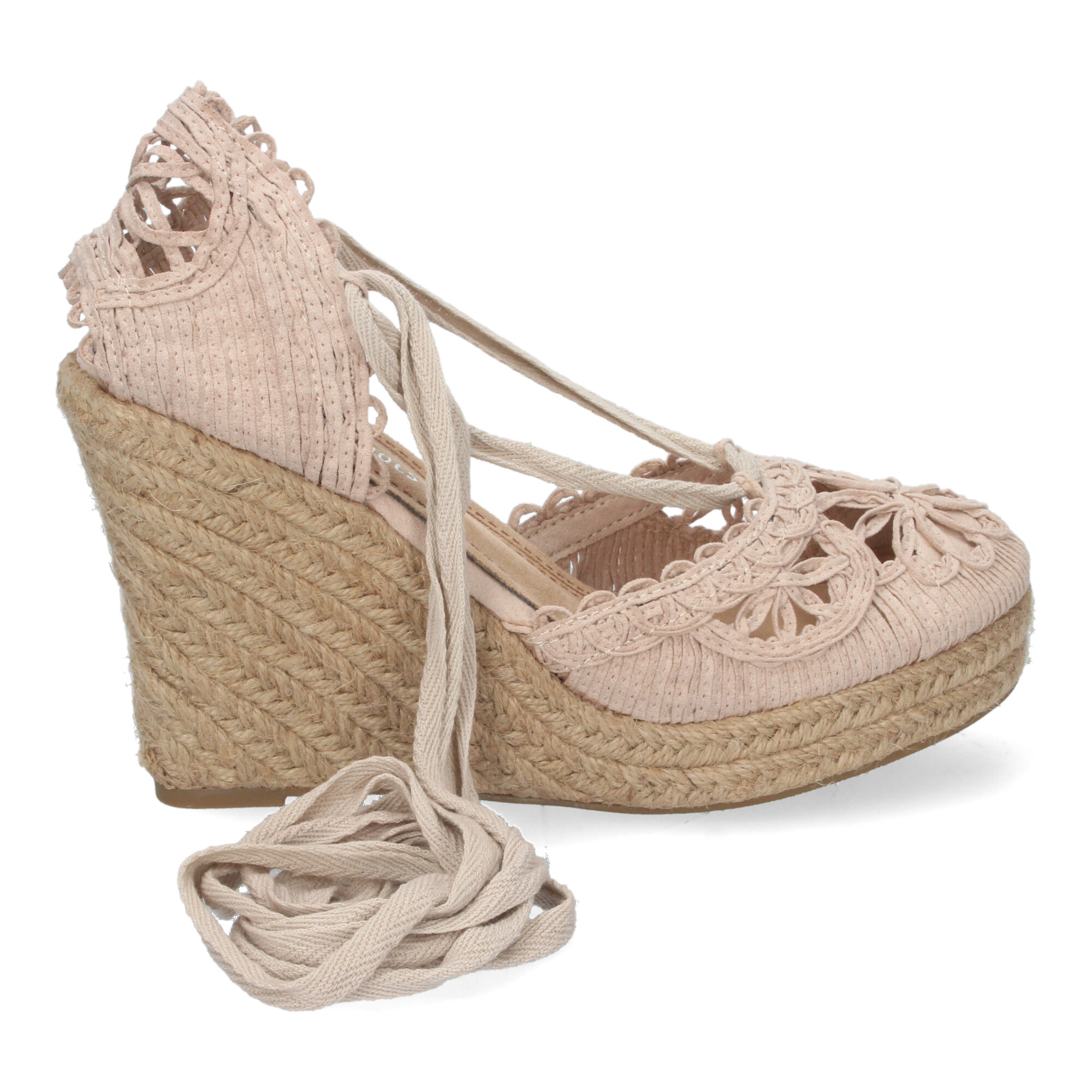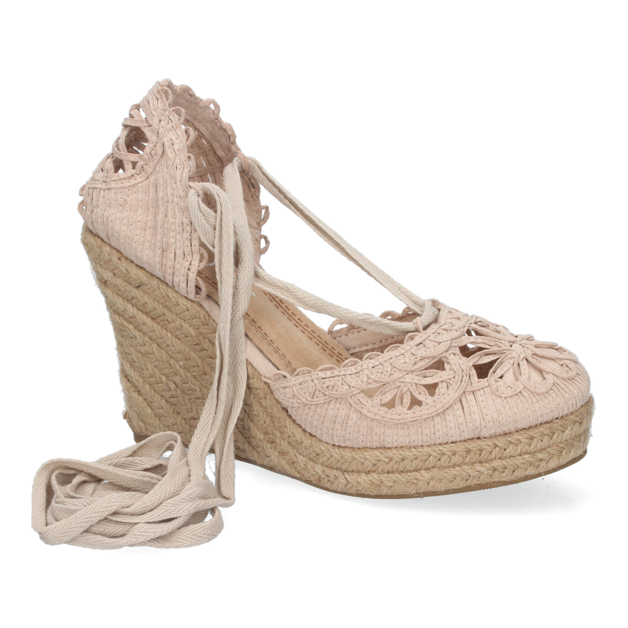 Sandalia de Cuña con Yute, Estilo Valenciana, Pala con Tiras Cosidas en Forma de Petalos de Flor, y Cierre de Cordones en el Tobillo Primavera Verano