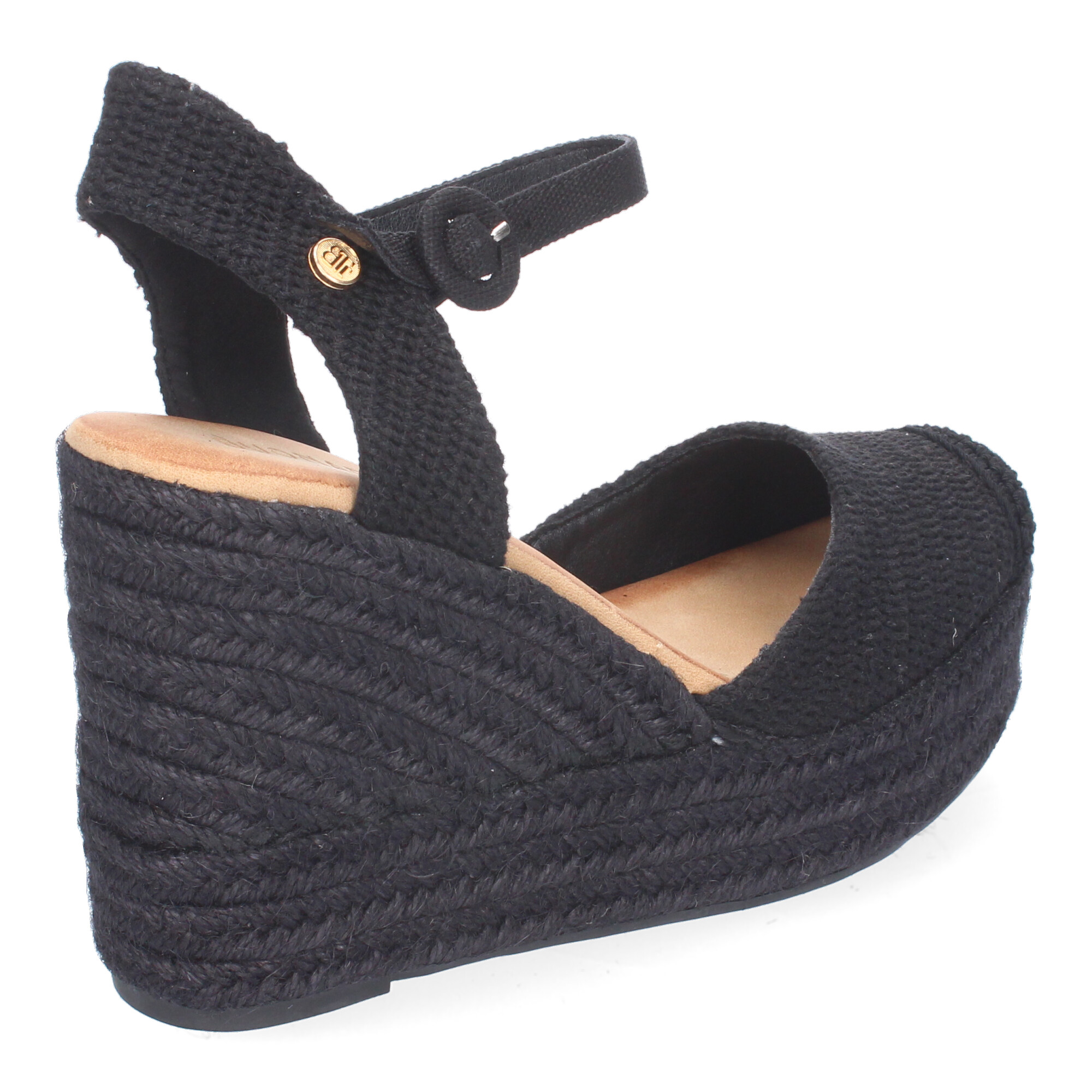 Sandalia de Cuña de Yute para Mujer con Pala Cerrada, Diseño Moderno con Detalle Metalico en el Talon y Cierre de Hebilla Ajustable.