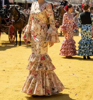 Trajes de tejido elástico de licra que garantiza adaptación y confort. Disponibles en talla XS, M, XXL. Se caractariza por su uso de tejido elástico de alta calidad, lo que permite tanto precisión en la talla como libertad para el movimiento y el baile. A diferencia de los vestidos de flamenca clásicos hechos en tejidos rígidos, este modelo ofrece mayor versatilidad sin sacrificar la silueta tradicional andaluza.