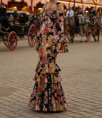 Traje de flamenca estampado floral, de tres volantes y manga larga.