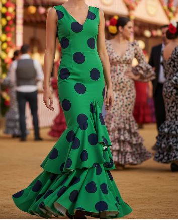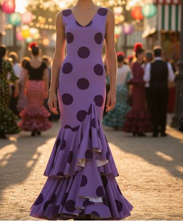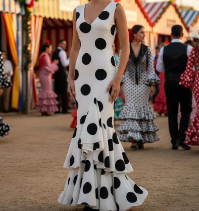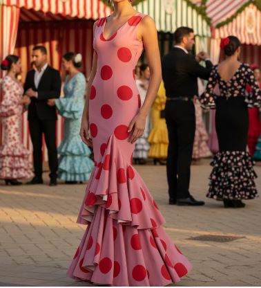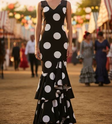 Trajes de tejido elástico de licra que garantiza adaptación y confort. Disponibles en talla XS, M, XXL. Se caractariza por su uso de tejido elástico de alta calidad, lo que permite tanto precisión en la talla como libertad para el movimiento y el baile. A diferencia de los vestidos de flamenca clásicos hechos en tejidos rígidos, este modelo ofrece mayor versatilidad sin sacrificar la silueta tradicional andaluza.