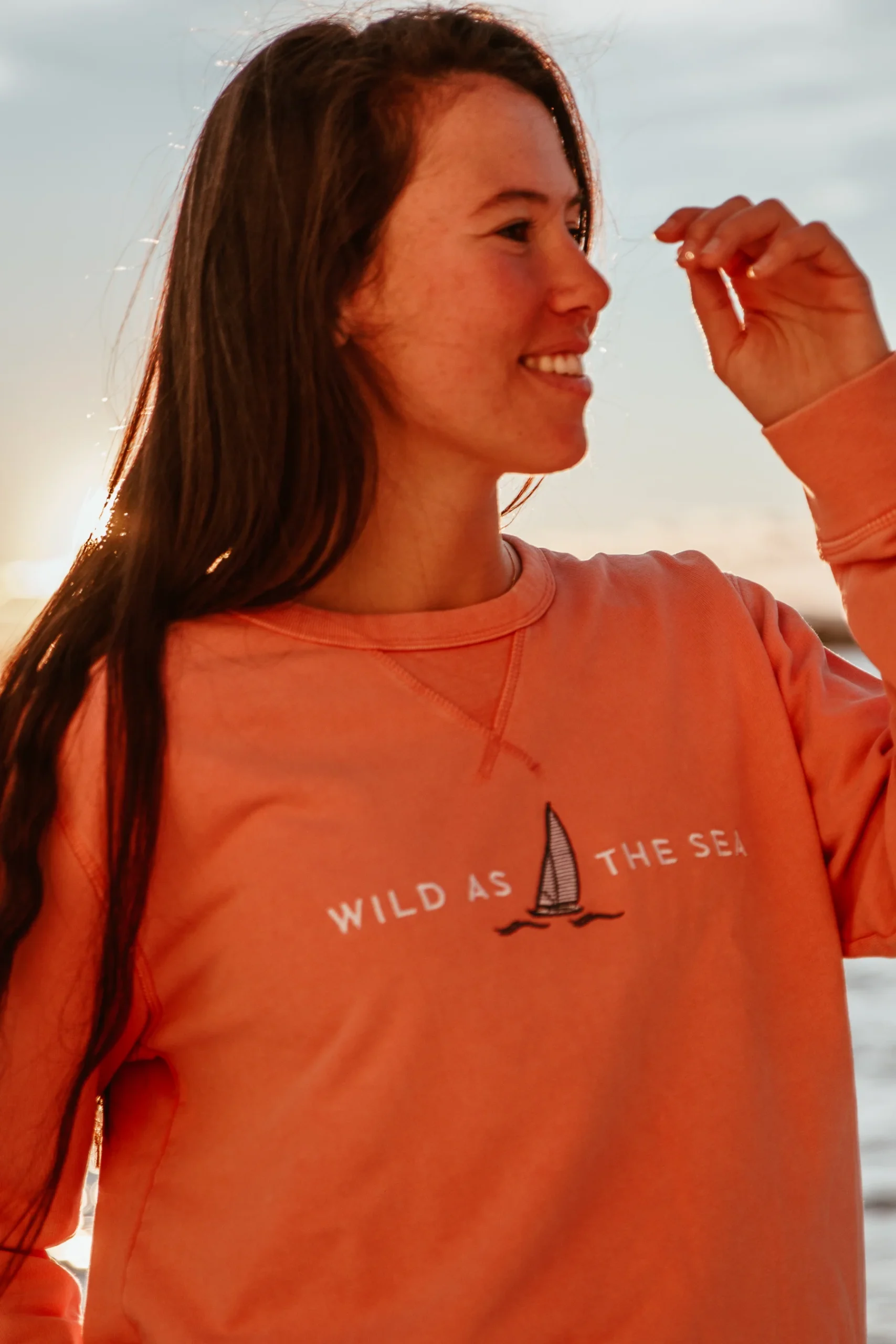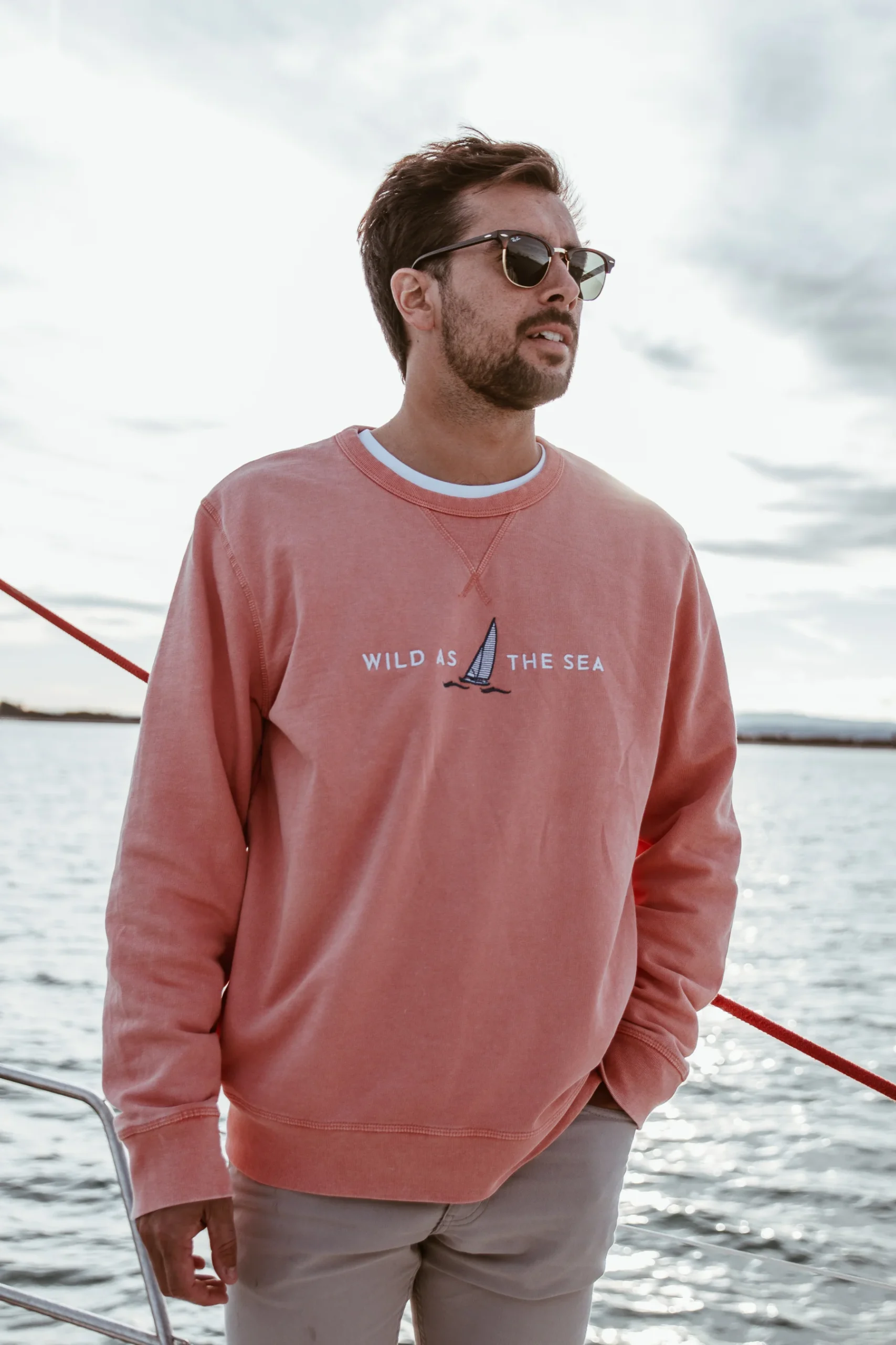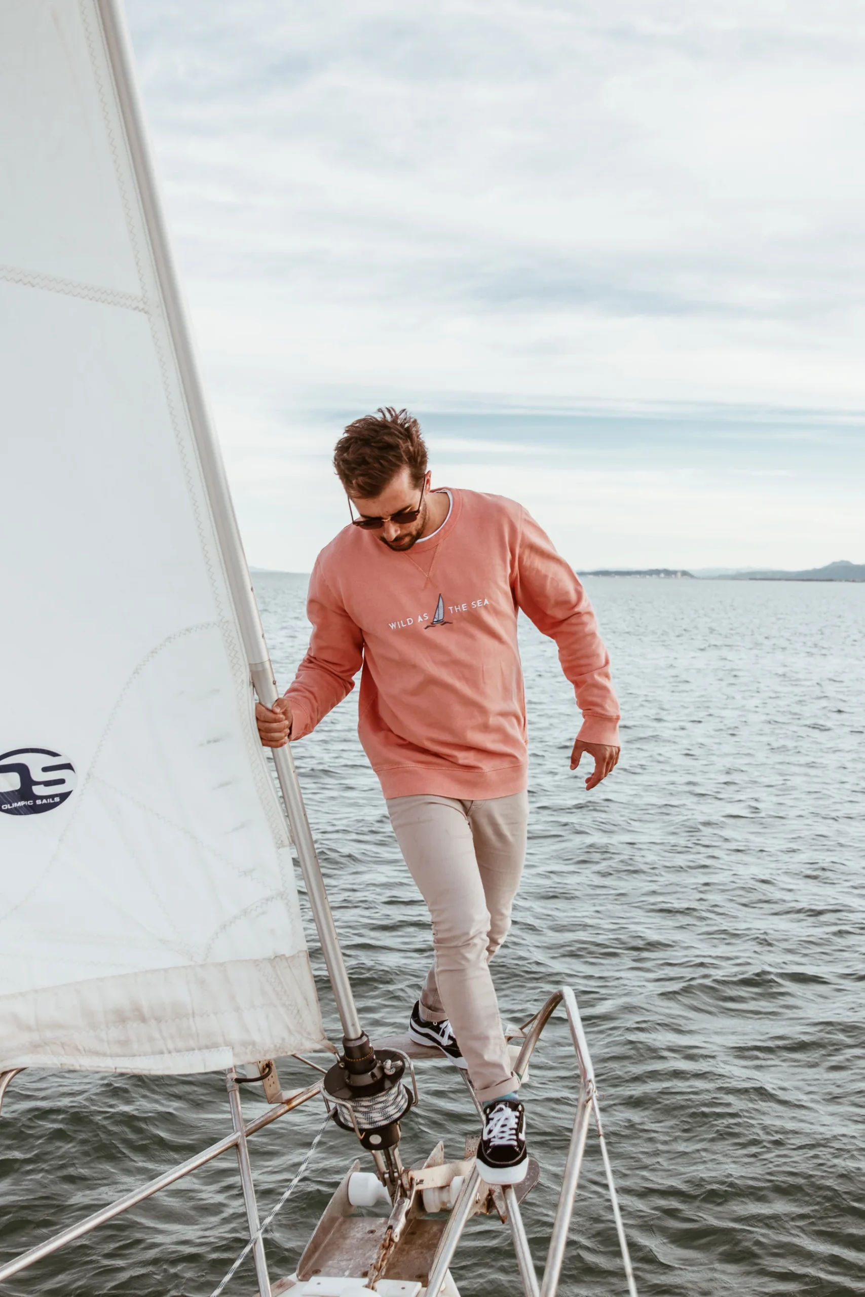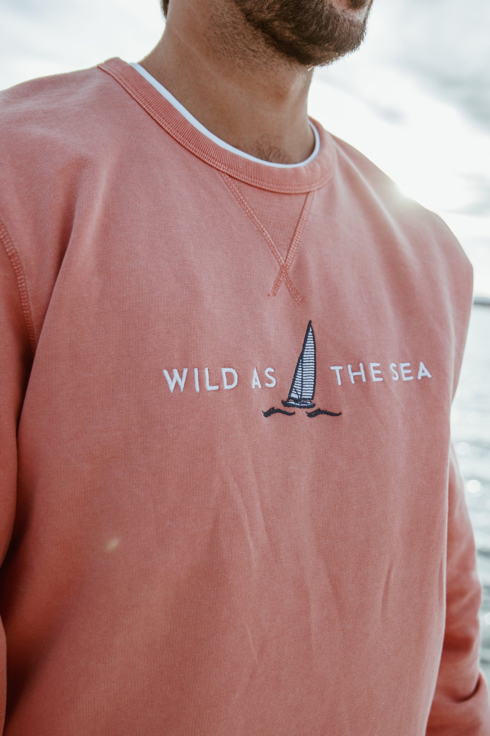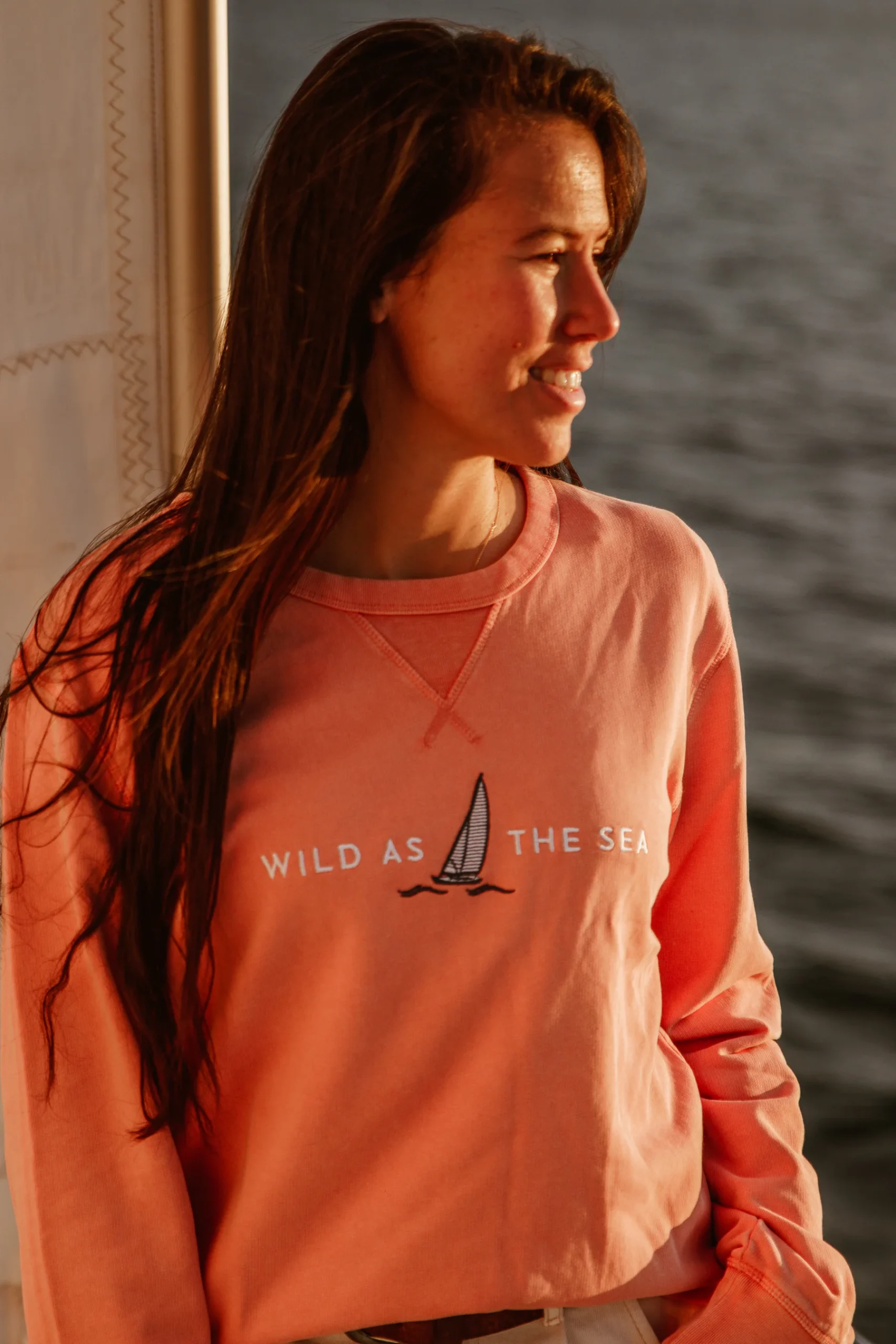 La sudadera coral presenta un detalle bordado en la parte delantera con la frase “WILD AS THE SEA” que no nos puede gustar más.