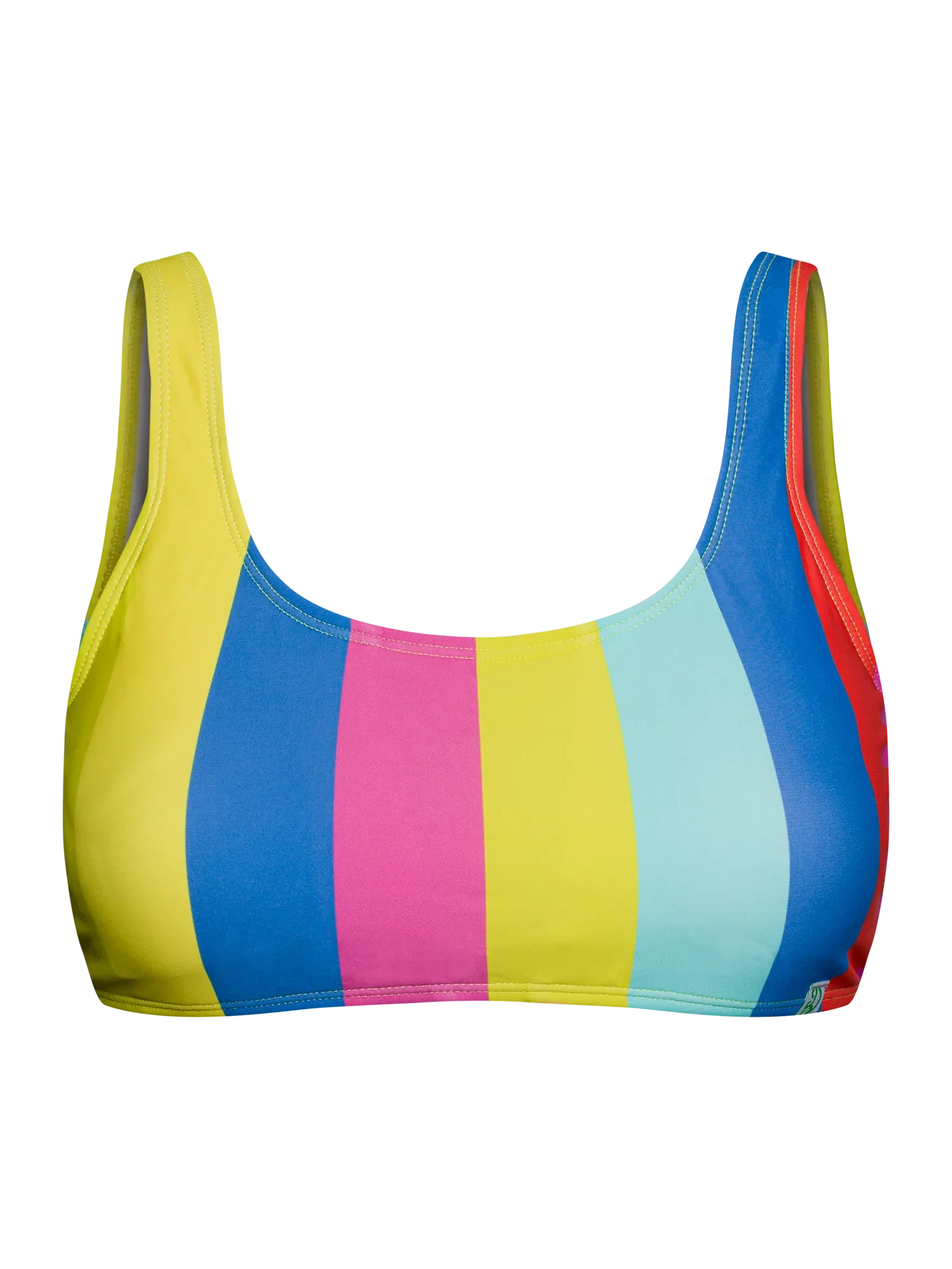 Las rayas son sencillamente inmortales. Si buscas un outfit moderno para la temporada del verano, te recomendamos este top alegre de bikini deportivo. Incluso lo puedes combinar con unos pantalones cortos o con una falda, pero recuerda que solo debe combinarse con un color peculiar. Apuesta por las rayas y demuestra que el mundo de la moda no te es tan ajeno.