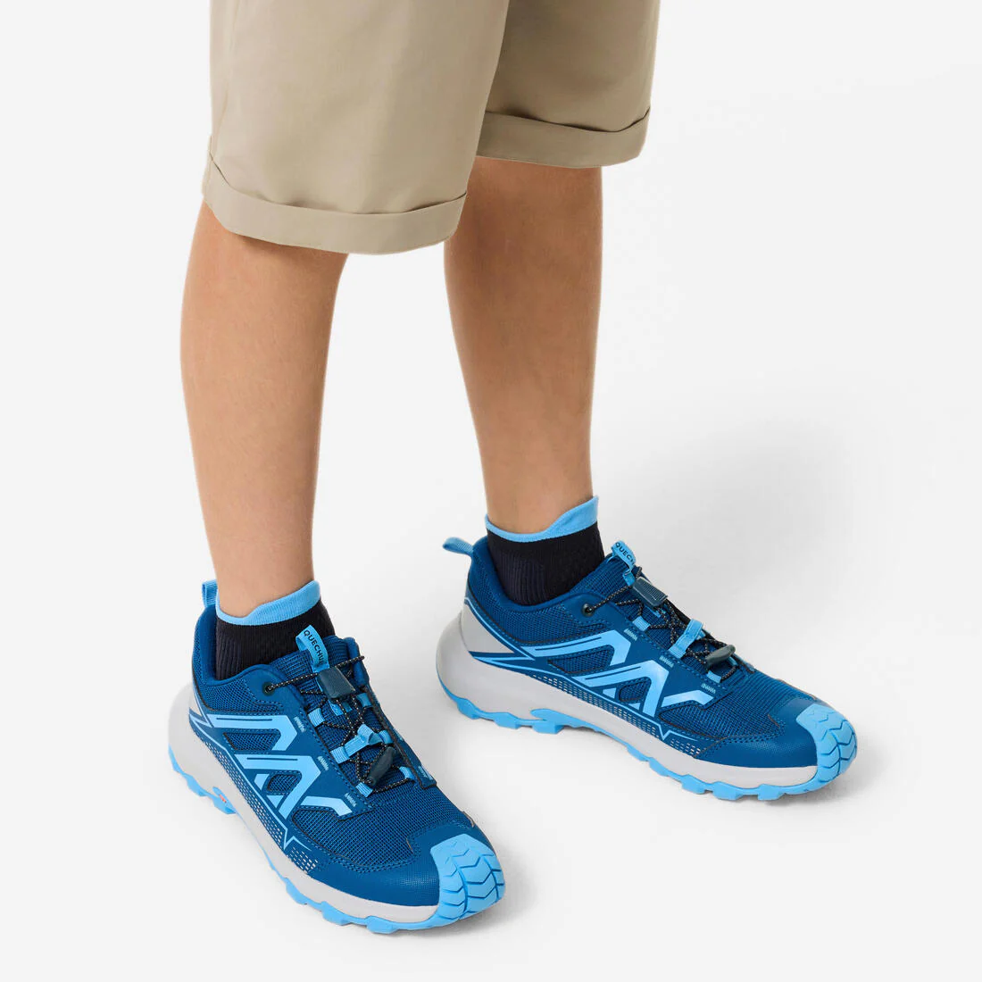 Haz que se pruebe las 2 zapatillas, de pie, con calcetines adecuados para el senderismo. Dos puntos de confort a comprobar: la sujeción del talón y de la puntera en los descensos. En las primeras salidas, deja que tu hijo las pruebe poco a poco, para que se adapten a sus pies.