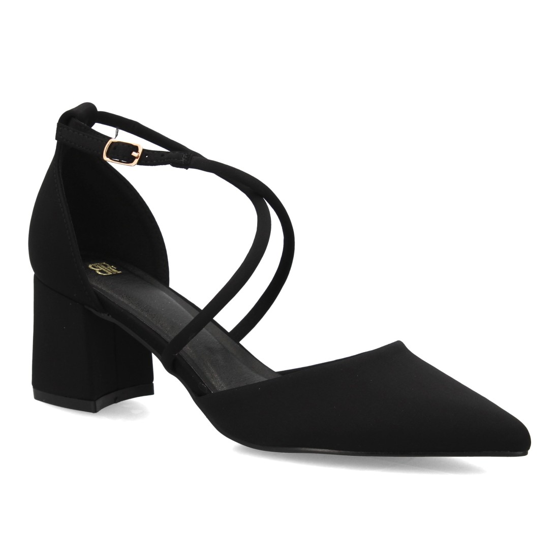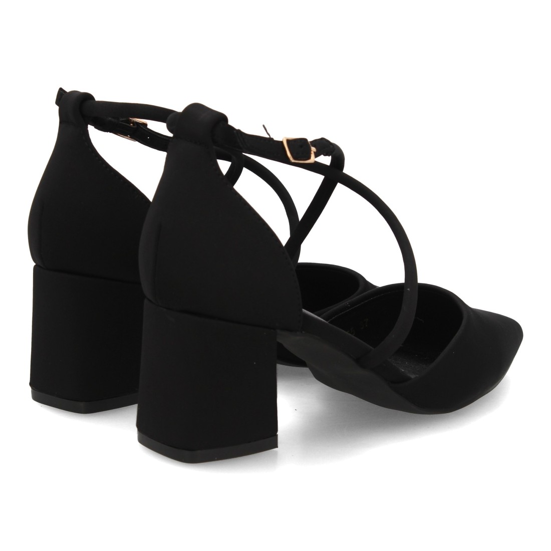 Zapato de mujer con tacón ancho medio y diseño elegante punta fina con adoro de tiras. Cierre de hebilla, Ideal para eventos, oficina, celebraciones o looks formales.